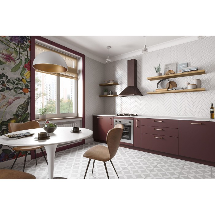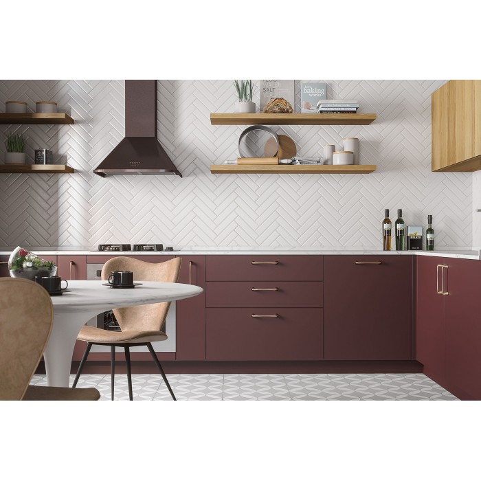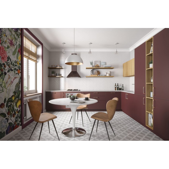 Кухня из пластика в сочетании со шпоном в модели Альп рождает невероятное количество вариантов. На данной кухне - Шпон Балтия и Fenix Росо джайпур. Магнетическая комбинация модных цветов: матовый винный, медный и натуральное дерево - создают сочную тёплую картину. Разбавлены модули разнообразными открытыми полками.