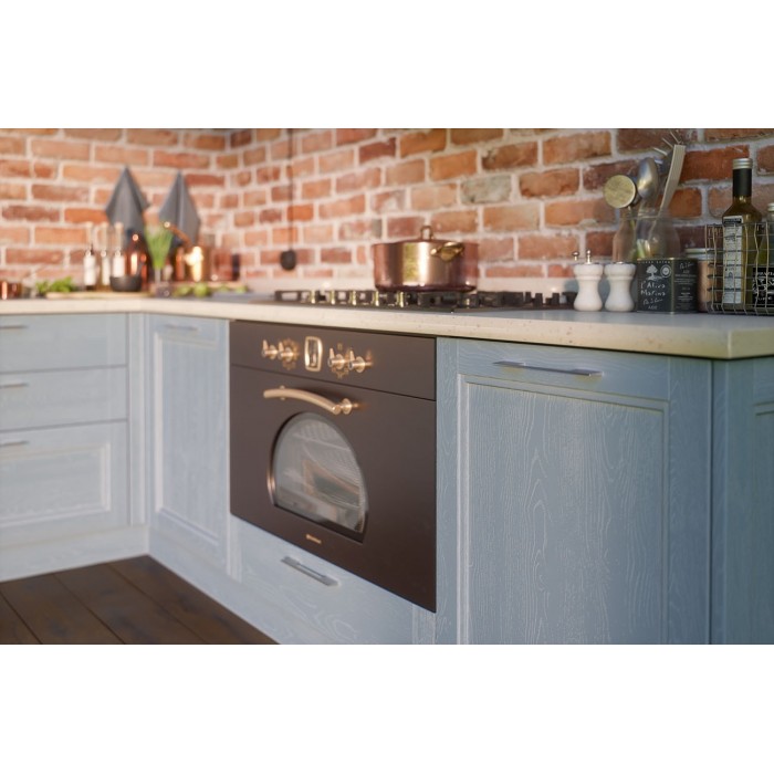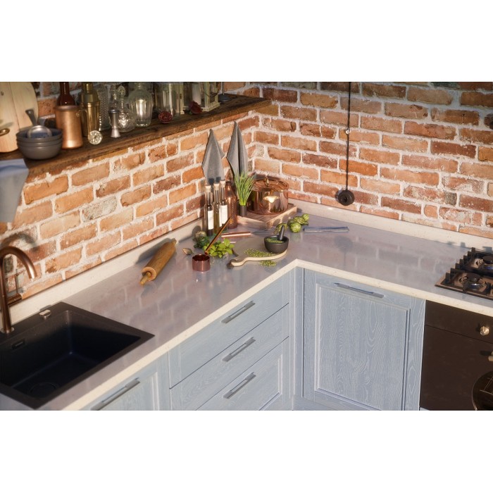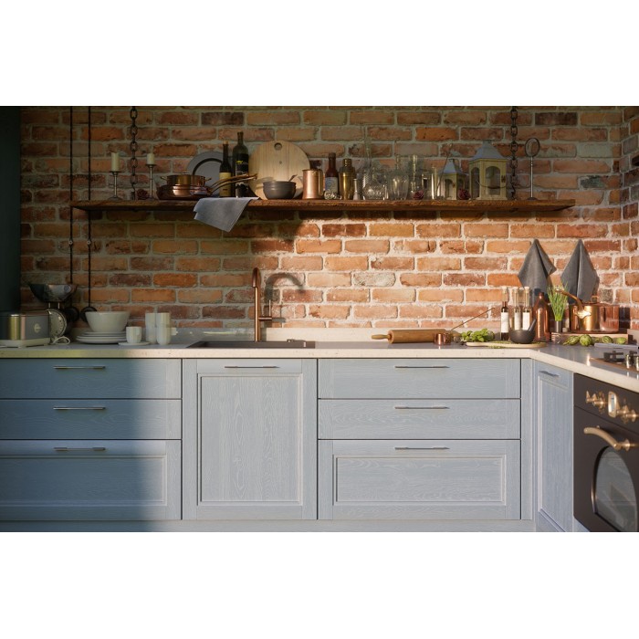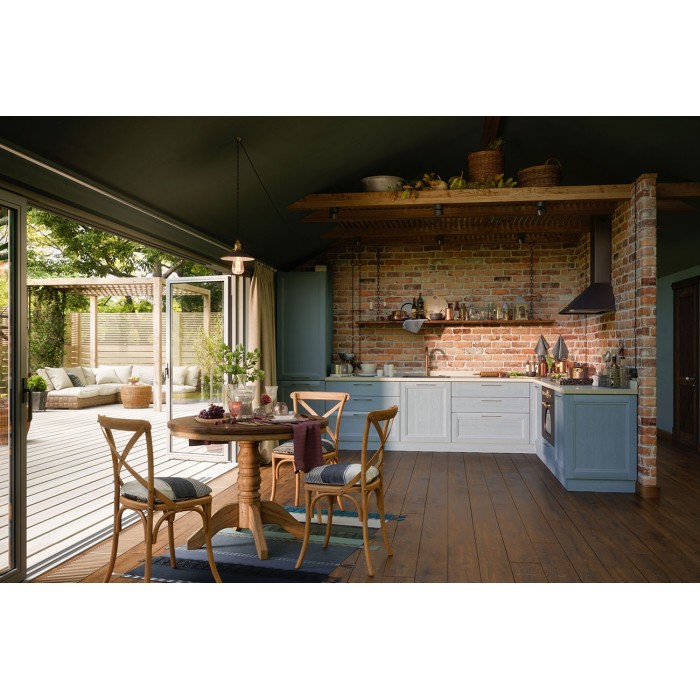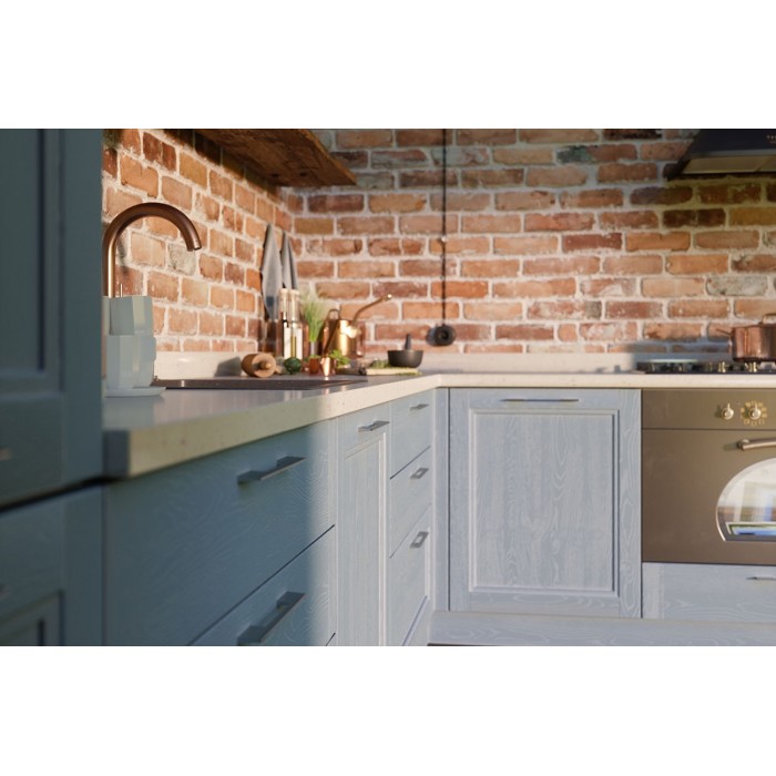 Кухня Алегри в эксклюзивном цвете Мистраль - серо-синий тон с белой патиной. Ручная отделка фасадов из массива ясеня, кирпичная стена, деревянные стулья создают ауру уютного дома. Кухня из массива является неотъемлемой частью популярного сегодня эко-интерьера.