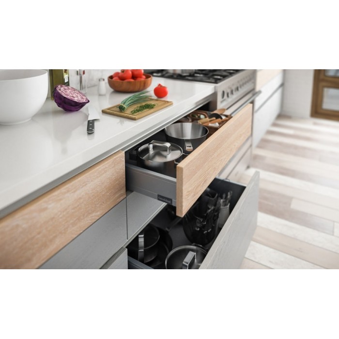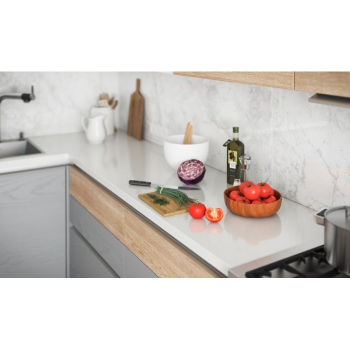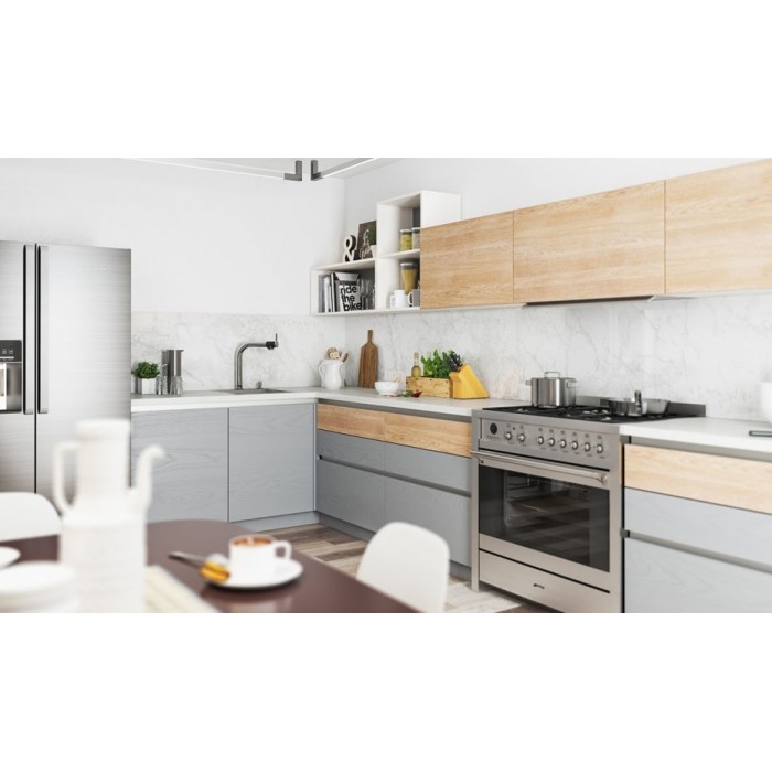 Модная угловая кухня с фасадом, облицованным шпоном ценных пород дерева, и алюминивым Gola-профилем. На кухне удачно комбинируется 3 цвета: светлое дерево - отделка Сноу с белой патиной, серый - отделка Грей, белый - шпонированные открытые полки в цвете Сиена.