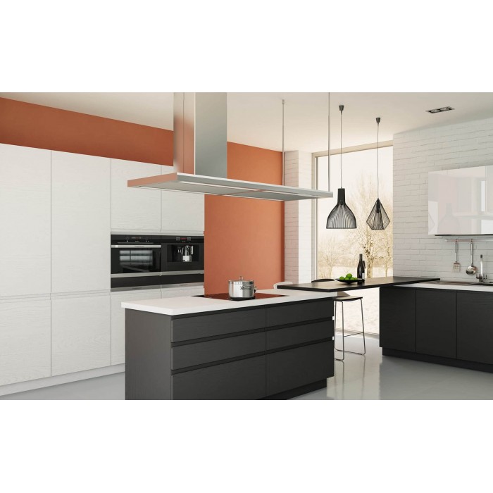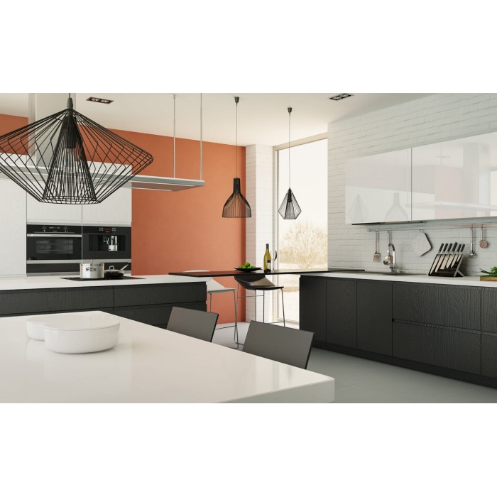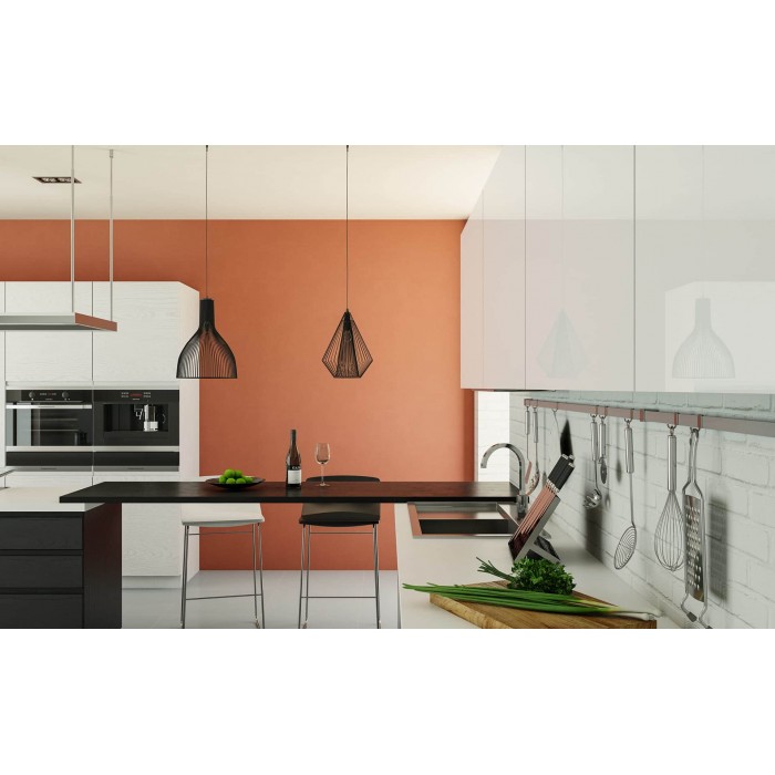 Современная кухня с прямым фасадом и J-профилем. Отделка нижних ящиков - Маренго, верхних - Сиена и акрил Brilliant Бьянко. Терракотовая стена служит яркой доминантой интерьера кухни, а графичные линии фасадов и металлических светильников четко прорисовываются на её фоне.